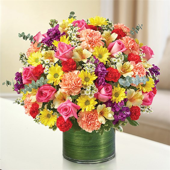 Express your condolences with our truly original sympathy arrangement of bright and beautiful roses, stock, alstroemeria, carnations and more. Designed by our florists to offer comfort to friends and family during difficult times of loss.• Graceful, bright-toned arrangement of roses, stock, alstroemeria, carnations, daisy poms, mini carnations and monte casino, gathered with variegated pittosporum and spiral eucalyptus• Hand-designed by our expert florists in a stylish clear glass cylinder vase wrapped with a Ti leaf ribbon; vase measures 6"H• Appropriate for the service or the home of friends and family members • Large arrangement measures approximately 16"H x 17"L• Medium arrangement measures approximately 15"H x 16"L• Small arrangement measures approximately 14"H X 15"L• Our florists hand-design each arrangement, so colors, varieties, and vase may vary due to local availability